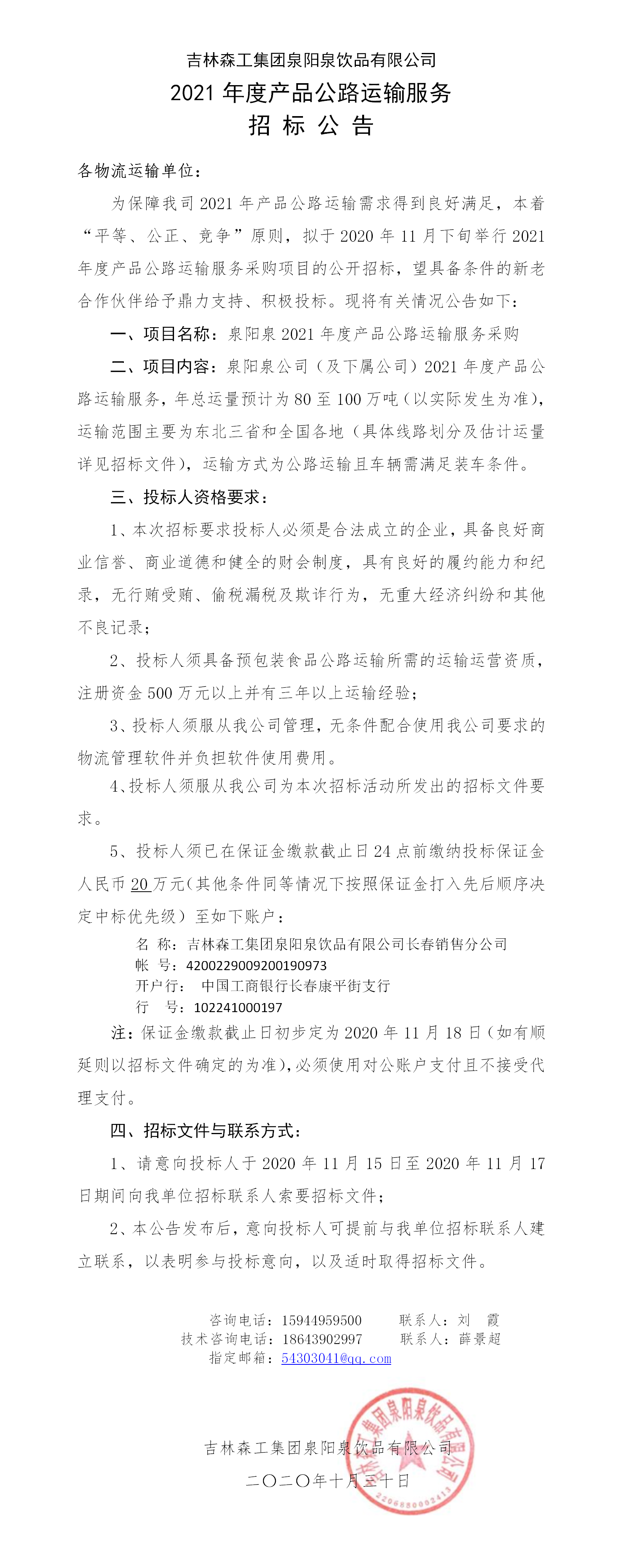 2021年度產品公路運輸服務招標公告